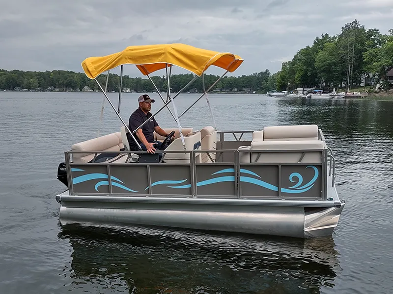 APM-14 Cruise Pontoon Boat/Engine Package - 9.9HP Click to see full view Features Premium Interior Bimini Top Full Snap On Mooring Canvas Cover Tohatsu 9.9HP LS Motor w/power tilt Electronic Fuel Injection 3-Gallon Fuel Tank 50 AMP Battery Boat Start Up Safety Package: Fire extinguisher, Paddle, (2) Life Vests (Adult), (4) Mooring Lines More Information Shipping Information Get more specifications Email me info on this product Buy Now Model: APM14-CPMT-9.9 (Water Ready! Early Spring Special) Special Price: $23,450