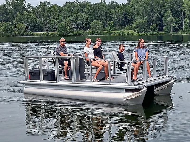 UTL14-R Sport Pontoon Boat/Engine Package - 9.9HP Click to see full view Description UTL-14R features a optional innovative railing system for quick conversion to flat top barge while providing the extra safety of full railing when underway. Using deck sockets, spring pins, and wing nut top side attachments, removing the forward left, right, and front rails requires no hand tools. Once loaded the railings are easily installed and you’re quickly underway. Features Three Swivel Fish Seats Center Bench/Cooler Seating Helm Canvas Cover Tohatsu 9.9HP LS Motor w/power tilt Electronic Fuel Injection 3-Gallon Fuel Tank 50 AMP Battery Boat Start Up Safety Package: Fire extinguisher, Paddle, (2) Life Vests (Adult), (4) Mooring Lines More Information Shipping Information Get more specifications Email me info on this product Buy Now Model: UTL14R-SMT-9.9 (Water Ready! Early Spring Special) Starting Price: $22,490